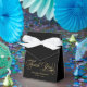 A wedding favour box featuring a black background with the words "Thank You" in faux gold foil and space for the names and wedding date of the bride and groom.