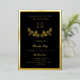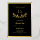 Black and gold quinceañera invitation with a golden half wreath. Black quinceañera invitation with gold foil greenery.