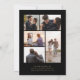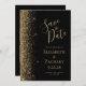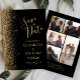 The left-hand edge of this elegant modern wedding save the date card features a gold faux glitter border. The customisable text combines gold-coloured handwriting, copperplate and italic fonts on a black background. The reverse side provides spaces for 5 photos (3 horizontal 1 square and 1 vertical) and room for your wedding website URL or other brief message.