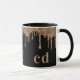 A classic black background with faux gold glitter drips, paint dripping look. Personalise and add a name and monogram initials. The name is written with golden modern block letters. White and golden letters.