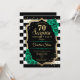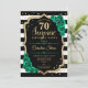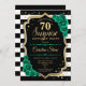 Surprise 70th Birthday Party Invitation. Feminine black, white and emerald green design with faux glitter gold. Features black and white stripes, roses, script font and confetti. Perfect for an elegant women's bday celebration. Can be personalized to show any age. Printed Zazzle invitations or instant download digital printable template.