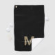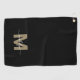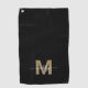 Create Your Own Personalised Custom Black Modern Script Name Monogram Golf Towel. This chic, feminine golf towel features a stylish monogram design with a flat gold initial (note: this is a printed gold colour, not metallic or shiny) on a sleek black background and a classic black script name for a personalised touch. Printed on one side, this towel adds a unique and elegant flair to any golf bag. It makes a fun and sophisticated gift, perfect for birthdays, holidays, Mother’s Day, or any special occasion when you want to celebrate someone—or treat yourself! Ideal for the golf lover who enjoys a blend of style and personalisation while staying practical on the course.