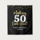 Black Gold Making AGE Look Good Name Confetti Tapestry Backdrop Sign. Celebrate any age birthday for her or him with this elegant, custom colour personalised tapestry sign or photo op backdrop personalised featuring the editable age title MAKING "AGE" LOOK GOOD with faux metallic gold foil modern script typography and confetti and name or your custom text (shown with HAPPY BIRTHDAY NAME) in your choice of background colour (shown in black) to coordinate with your party theme colours. ASSISTANCE: For help with design modification, transferring the design to another product or for coordinating items, contact the designer BEFORE ORDERING via the Zazzle Chat MESSAGE tab below or email makeitaboutyoustore@gmail.com.