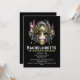 The face of a beautiful woman with porcelain white skin and red lips has her dark charcoal grey hair framing her face with soft curls. She is wearing an ornate black and gold Venetian face mask that has dark purple feathers on the top outer edges. She is set against a black background that makes her pop. This elegant ai watercolor graphic is ideal for a bachelorette, birthday, sweet sixteen or quinceanera party. Simply personalise the editable text templates to suit your special occasion.