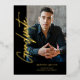 Celebrate your Graduate with this Photo Black Gold Modern Script Graduation Gold Foil Invitation Postcard designed in black, with a central photo, Graduate and Grad name, class and School in Gold Foil. Add graduation party details on the back of the postcard. This invitation is perfect for a male graduate like your son who is graduating from college or high school.