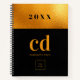 A blackand faux gold metallic, foil looking background. Golden text. Personalise and add your logo, monogram initials, name and a year. Your logo both on the front and the back. Space for your website address on the back.