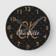 Black gold monogram initials name script elegant round clock