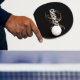 Modern ping pong paddle with an elegant black background, a scripted golden monogram and a white typography name. Personalise with your name and monogram.