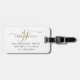 A minimalist gold and black monogram stylish luggage tag on a white background, contrasted with a serif typography name.
