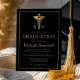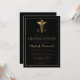 This classic, elegant graduation party invitation design features a gold-coloured caduceus flanked by two editable letters (for example, RN for Registered Nurse) on a black background. Personalise the text with the graduate's name, school and year, along with the party details. A thin, gold-coloured rectangular border frames the design. The back of the card is solid black,