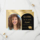 On front: Add your own vertical size photo of the graduate. Faux gold photo arch frame. A golden and black background, golden text. Templates for a name and date. The name and the text: Save the Date are written with a modern hand lettered style script. With a cap, tassel topper.
