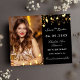On front: Add a vertical size photo. A classic black background colour, decorated with faux gold stars. Personalise and add a name and details. White letters. For both him and her.