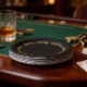 Add a refined touch to your poker night with these Black & Gold Casino Night paper plates. Featuring a minimalist black background framed with an elegant gold laurel border, these plates bring a sophisticated casino-inspired look to your party table.