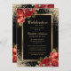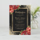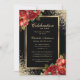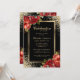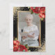 Elegant black and gold floral celebration of life invitation featuring a gold frame adorned with red roses and greenery. A photo at the back.