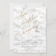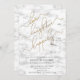This beautiful, modern Black White and Gold Script Marble Rehearsal Dinner Invitation features a faux gold leaf calligraphy script reading 'To Love, Laughter, and Happily Ever After' as the main design element, over a background of faux Carrera marble. The design is beautifully complemented by the modern all cap sans serif font detailing the rehearsal dinner time, date and location. The back of the dinner invitation features a faux marble texture as well, to complete the chic, sophisticated look.