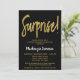 An elegant, modern black and gold surprise retirement party invitation. Glam script text at the top and gold text below with the name in stand-out white