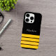Nautical and maritime style, four golden captain stripes on black. Add your name on front, name and contact information on back. Yellow/Orange letters.