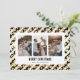 Black and gold photo Merry Christmas card featuring a collage of three photos and a black and white striped background with stars. Easily personalise this cute holiday card with your photos and the family name.