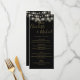 Elegant black and gold wedding menu card featuring pretty string lights and signature style names. This modern menu card can be personalized with your information in chic gold lettering. Designed by Thisisnotme©