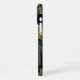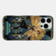 An elegant 1920s cabaret dancer poses gracefully in a stunning black and gold costume, adorned with magnificent golden peacock feather fans against a deep midnight blue background with ornate teal Art Deco architecture. Inspired by Gatsby-era jazz age glamour, Moulin Rouge cabaret art, and 1920s Art Deco illustration, this design captures feminine power, movement, and golden opulence. The peacock dancer iPhone 16 Pro Max case is a perfect gift for dance lovers, Gatsby fans, cabaret enthusiasts, and admirers of bold feminine Art Deco luxury. Slim fit case, wireless charging compatible, full-body protection with pure golden glamour.