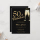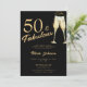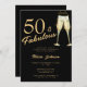 Modern faux gold trendy calligraphy script 50 and fabulous years black birthday party invitation with champagne flutes.