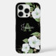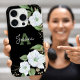 A chic, stunning, sophisticated, white and faux gold glitter floral watercolor with personalised script typography and a san serif type monogram initial overlay a dramatic black background on this chic, elegant, modern cell phone case. Personalise with your name and monogram. Makes a fun and stylish statement every time you use it. A great gift for a friend, as well as yourself!