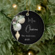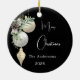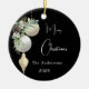 An elegant, modern black background. Decorated with white and gold baubles and some greenery and a pine cone. Personalise and add your name, year. Text: Merry Christmas