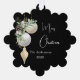 An elegant, modern black background. Decorated with white and gold baubles and some greenery and a pine cone. Personalise and add your name, year. Text: Merry Christmas