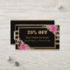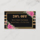 Modern elegant classy black and golden stripes with golden border watercolor pink flowers and back side QR code discount business card on golden background. You can easily change all details, fonts, colour, size and background colour,front and back both side. Replace your own QR code to your website on social media account.