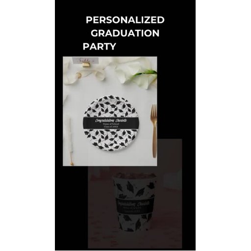Black graduation caps thrown in the air make a nice design on thhis graduation tablecloth for a black and white high school or college graduation party. Black graduation caps on a white background.