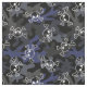 Camouflage fabric in fields of blue, charcoal, and black and a pattern of skull outlines in white.