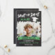 Cool graduation save the date card with a printed chalkboard background and a cool chalkboard font with a green banner and white graduation cap in a distressed look. Add a photo of the graduate inside a brush stroke frame. Distressed chalkboard graduation save the date card personalised with a photo and with green as the accent colour. A cool design with a photo template.