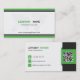 White background with green and black lines. On the front side, you can see a blurred map of the world. The back side contains your information and a QR code. Simple and modern