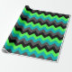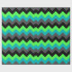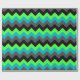 A roll of wrapping paper featuring an elegant pattern design of multicolored chevrons in black, grey, green and turquoise.