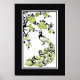 Black, green peacock and cherry blossoms custom design, featuring a black, lime green silhouette of a peacock bird and a cherry branch -sakura tree- with lovely flowers with metallic crumbled texture effect on white background and a black border around it. An elegant, floral template design with an oriental Asian flair. This girly design is fully customisable.