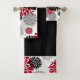This attractive three piece towel set features a black, grey, white, and red graphic flower pattern as the background. The big bath towel is solid black, with the flower pattern as a bottom border. The hand towel and wash cloth have the pattern, and contrast beautifully with the bath towel. Very dramatic, with a splash of colour! Be sure to see the matching home decor products in our store. *Graphic Design credit to Malachi Designs on Etsy.