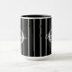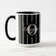 Grey stripes all over this coffee mug over Black with an interior and handle in Black.  A monogram sits in the centre for you to personalise. Shown here is a sample monogram of a "O" and a breezy text reading "Oregon" across the O. Grab some for your next Sunday in the cave.