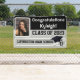 This is an outdoor grade vinyl banner with metal grommets. It can be fully personalised with the student's photo, name, message, class year, and town & school name. It includes matching cap and diploma artwork, which may also be customised.