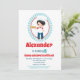 This boy's birthday invitation features a cute black haired boy holding a pizza, wearing a chefs hat, apron and blue jeans with red t-shirt. Perfect for a pizza party.