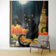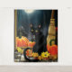 A black cat sits in a doorway with pumpkins, lantern, broomstick, autumn leaves and a full harvest moon in behind.