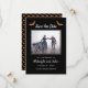 A gorgeous foil bat makes this Save the Date card stand out. The background on the front is midnight black and there is a bat pattern on the back. Perfect for a goth or Halloween wedding. See our other gothic wedding ideas as well.