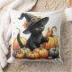 Black Halloween Kitten With Pumpkins & Witch's Hat Cushion