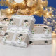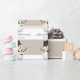 Destei's cartoon illustration of a cute smiling snowman. The snowman is wearing a black hat and a scarf that has green and white stripes. The background colour is beige with a pattern of white dots. Under the image it reads "Merry Christmas!" in green colour. There is also a personalizable text area where you can write either to whom the gift is for or from who it is from, for example.