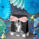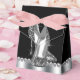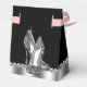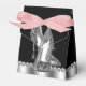 Beautiful black and silver glitter high heel shoe party favour boxes. These elegant black and silver glitter high heel shoe favour boxes can be customised with text and you can change the background colour and bow colour.