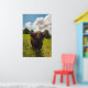 Black highland cow grazing green field sun light. Photograph of a majestic black highland Scottish cow grazing on a summer green field with grass in mouth and chicory flowers in front. In the background there is a beautiful blue sunny cloudy sky. Available on many products varying from prints to party supplies and sport equipment.