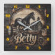 A black horse stands proudly near a rustic barn, surrounded by farm tools and foliage under a decorative design featuring the name Betty.