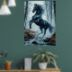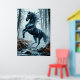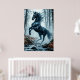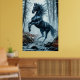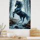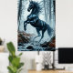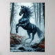 A powerful black horse rears up while crossing a flowing stream in a misty forest. The scene evokes strength, freedom, and natural beauty in a serene and atmospheric winter setting.