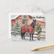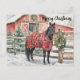 This Christmas postcard showcases a stunning black wearing a red tartan turnout blanket, standing beside a post adorned with a festive wreath. The scene is set against a backdrop of snow-covered ground and a red barn. This makes it an ideal selection for any horse enthusiast or horse farm owner. "AI-generated artwork with design direction by Susang6"