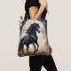 Pictured In Front Of A Full Moon In A Flower Field Is A Black Horse Rearing.