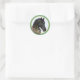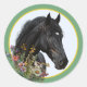 Black horse stickers. Wildflowers grow near the head of a beautiful black horse. He has a tiny bit of white on his face, but everything else is black. The sticker is pale blue with a green border along with a thin line of yellow gold. Round stickers come in two sizes.